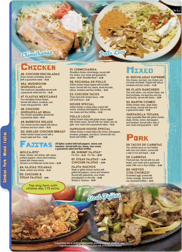 Grilled chicken or steak cooked with onions, tomatoes, and jalapenos. Served with rice and beans and flour tortillas.