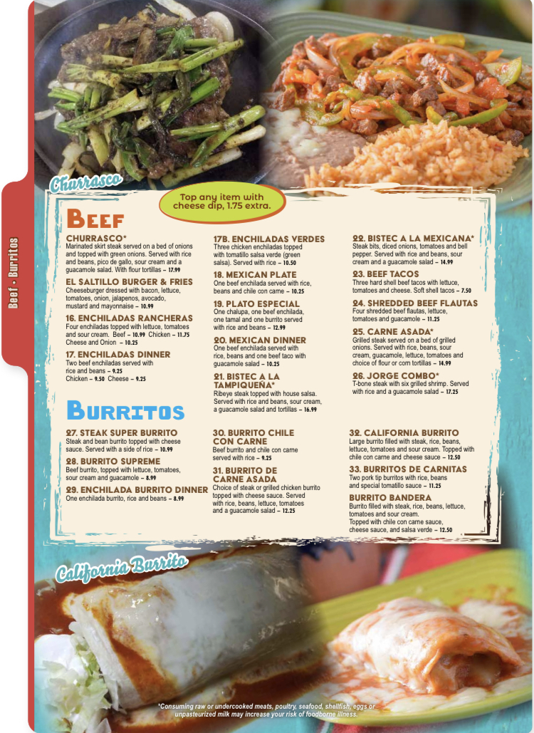 Burrito filled with beans and rice, and your choice of ground beef or steak. Topped with cheese sauce.
